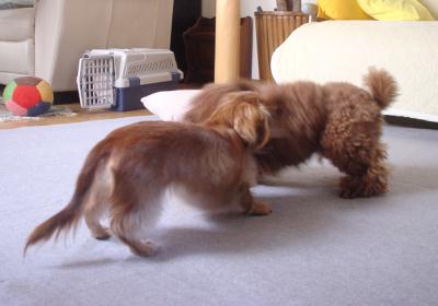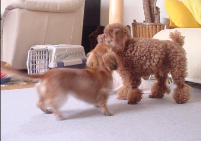 すっかり元気になったハッピーたんは、家に帰るといなやロミタンと思いっきり遊びました。 |