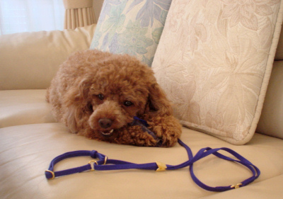 その安全なはずの首輪をキツく付けていても、力を入れると抜けてしまう「北斗の剣」のケンシロウのように 首が太くて顔の小さいハッピーたん。。 そこで店長が、選んでくれたのがこのリードです。 普通に着用できるのですが、犬が引っ張ると締まり絶対抜けることはないという優れもの♪ よかったよかった♪これで安心してお散歩が出来そうです。 手元のゴムの部分をロミタンは妙に気に入ってカミカミし始めました。 あぶないあぶない、すぐに破壊されちゃうよ〜〜!