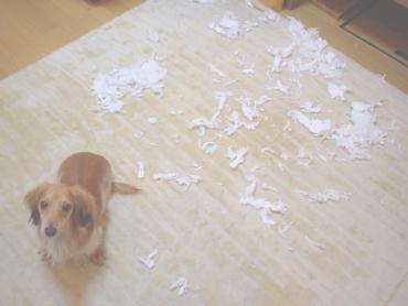 私の行く所、行く所くっつきマンのワン達がいやに部屋で大人しく遊んでいる。 あやしいーーーー 部屋に入ってみると。。。。 お〜〜〜〜ぉぅ!案の定! トイレットペーパーの花が咲いたようです。 「枯れ木に花を咲かせましょう♪」 ![]() ハッピーたんは「はなさかじいさん」だったのです それにしても、汚いなぁ・・・>< |