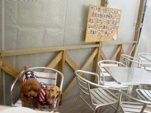 テラス席だけど、周りを囲ってあって温室みたいでした。 ここはお店の人が感じがいいのでお気に入りです。 誰もいなかったので、リードを放してやるとウロウロしていましたが、風で囲いのビニールが ガサガサっていうのが怖いのでしょうね、そ〜〜〜と警戒しながら歩いていました。 |