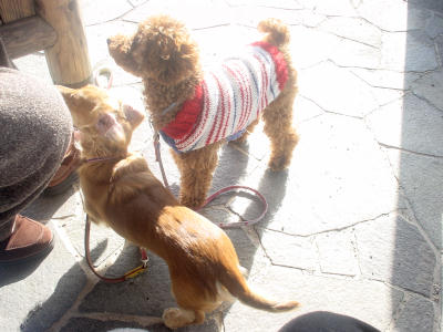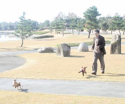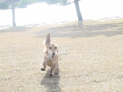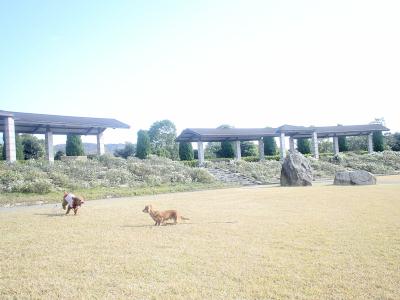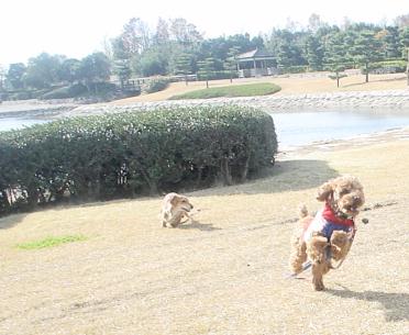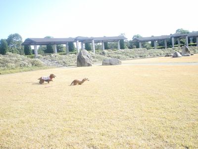 わぁーい!ひろいな〜 手入れの行き届いた広大な芝生の庭には誰一人いません。 ロミ&ハピはドッグラン状態でした。ナイショ♪ |