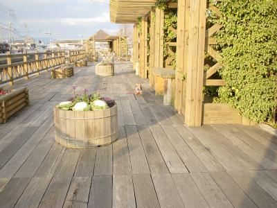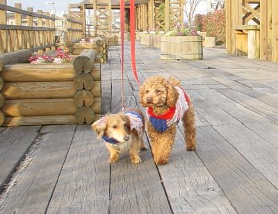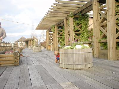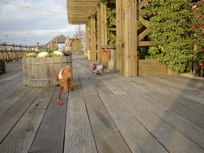 お散歩の人はほとんどいませんし、大抵の方はすぐ横の道路を歩きます。 このデッキの公園にはほとんど人はいないので、ワンたちはドッグランを満喫することができます。 |