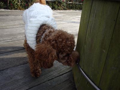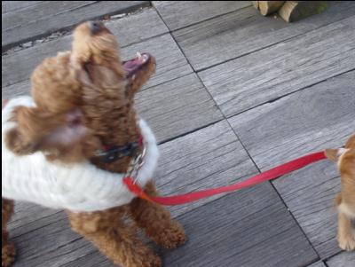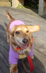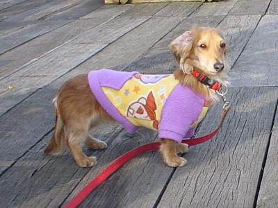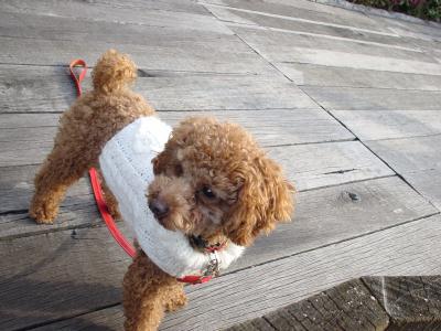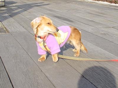 春のようなうららかな暖かな冬です。 下校途中の小学校2〜3年生位の女の子に囲まれました。 「白いお洋服を着たのが、トイプードルで、ミニモニのお洋服がミニチュアダックスよ」って、 とても詳しいです。 |