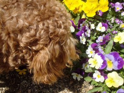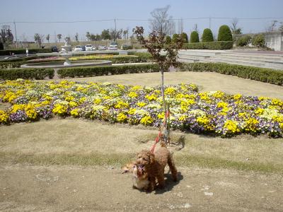 浦安総合体育公園の噴水のある庭です。 パンジーは今が盛りと咲いていました。 ロミタンのクルクル頭が写っています。 |
